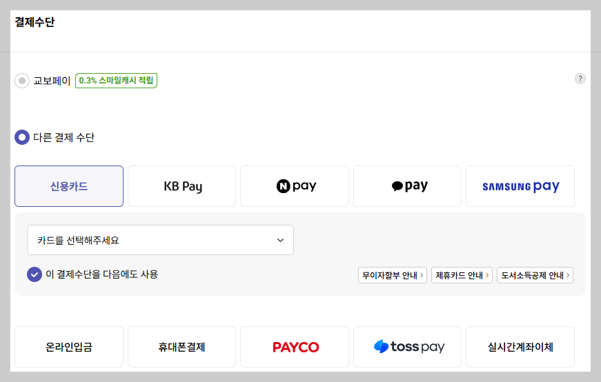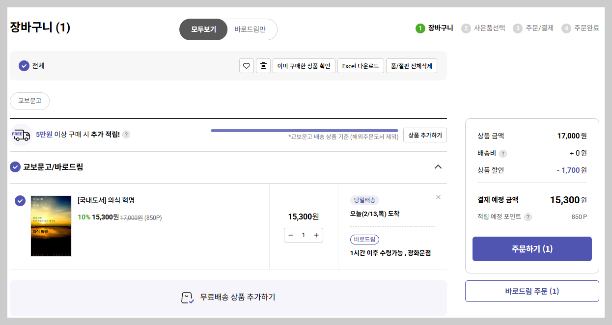 다음 도서 구입시에는 교보문고로 들어가서 로그인하고 구매할 도서를 찾아 장바구니에 담아 결제하면 된다.