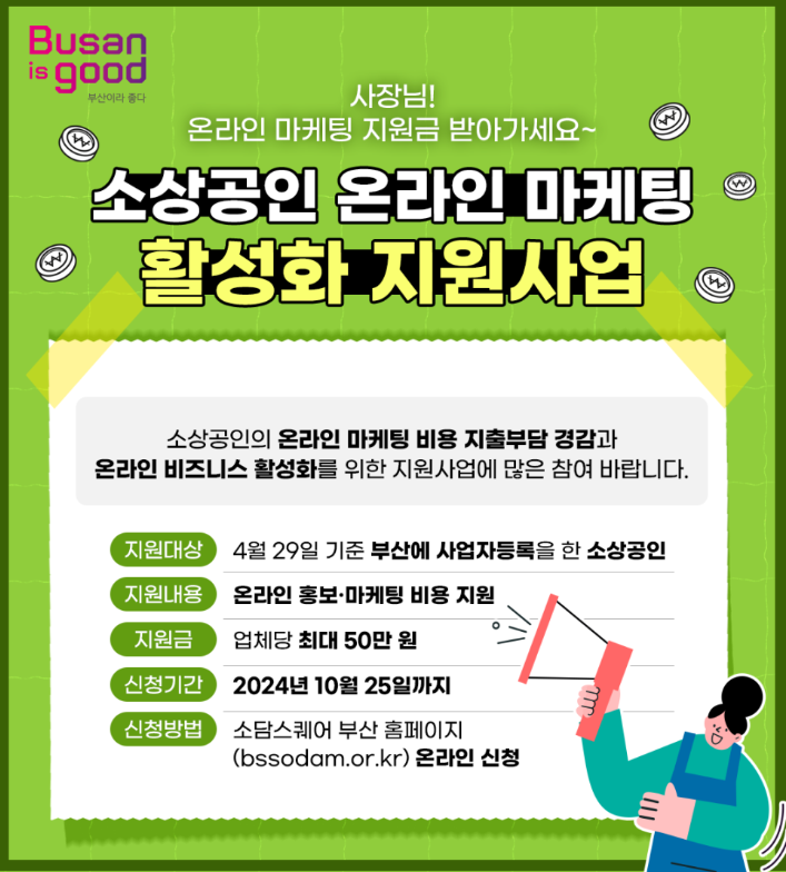 부산시는 소상공인을 위한 온라인 마케팅 활성화 지원사업의 일환으로 온라인 마케팅 지원금 최대 50만 원을 드립니다.