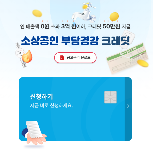 24년과 25년 매출이 3억 미만인 소상공인을 대상으로 공과금 및 4대 보험료에 소요되는 비용을 최대 50만 원까지 지원한다. 지금 신청해서 12월 31일까지 사용하여야 하니 시기를 놓이지 말고 신청하여 혜택을 받자.